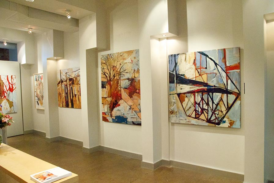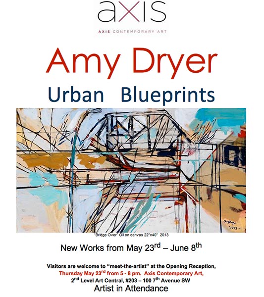 The origins of the city are explored in a dynamic new series of oil on canvas paintings by Calgary artist Amy Dryer. Known for her expressive and confident style, painterly quality and exuberant colour palette, Dryer brings ‘Urban Blueprints’ to AXIS gallery this month. Exploring the streets, alleyways and train tracks of the city, Dryer’s paintings work with the familiar patterns of urbanization. Lines of electrical wires crisscross the horizon, train tracks web through railway yards, and the foundations and girders of bridges and buildings dot the landscape. This is the subject of Amy Dryer’s ‘Urban Blueprints’.