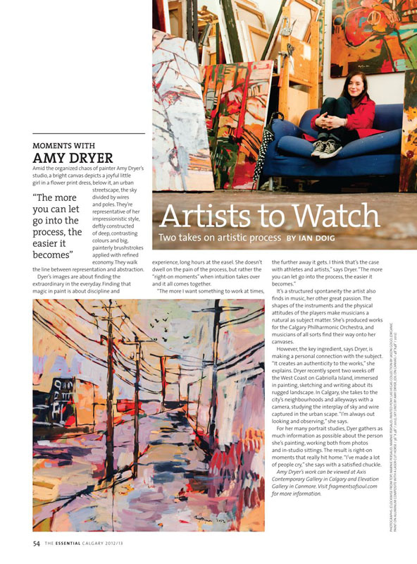 Just wanted to send you an update to highlight a few recent events in my world. I am excited to be featured as an ‘Artist to Watch’ in the newly published ESSENTIAL Calgary Magazine 2012/2013. Ian Doig writes of my work and practice and my ‘painterly brushstrokes applied with refined economy that walk the line between representation and abstraction.’ Marnie Persaud took a photo of me in my studio to accompany the article. To see more of Marnie’s photography, please check out her website: http://www.marniephoto.com.