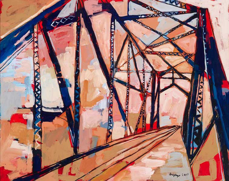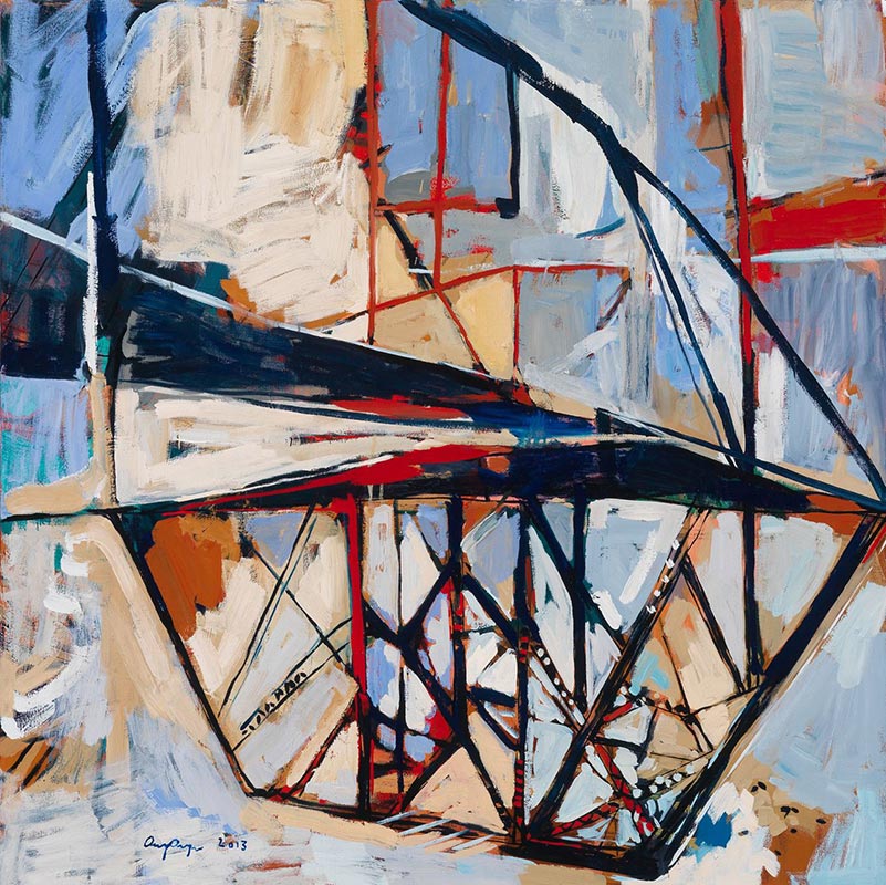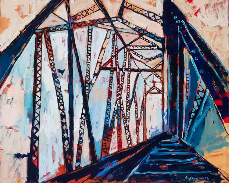 In Galleries West, Tom Hardy writes about my work: “Amy Dryer’s hometown of Calgary, where she continues to live, has become the subject of her new work. This engagement is all inclusive, allowing her to paint outdoors and bring her attachment to the city into her painting practice… In a work like Train Through, she energetically pulls together disparate elements to create the urban atmosphere that interests her. There is open, silent, empty space transformed by the bolting passage of a grinding train, faintly outlined, like a ghost. Networks of lines organize the space like a scaffold or skeleton, and patches of colour then flesh it out, the train moving through like a memory or an emotional response. Rather than taking the body as a subject, as in earlier paintings, this new work allows Dryer to focus on more delineations of space, yet still treat the city as a body, a figure with a history.”